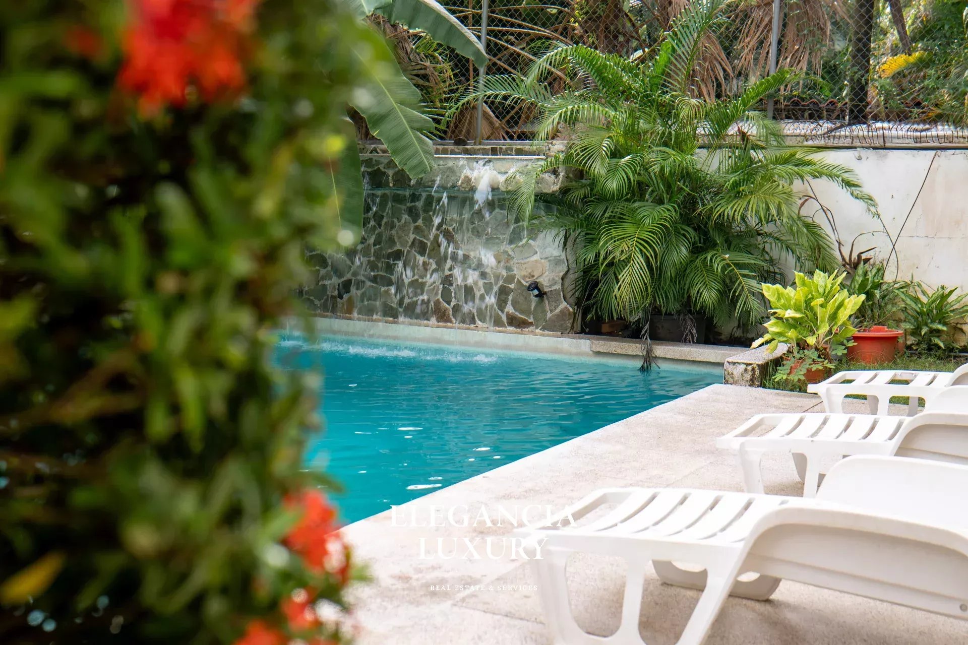 Piscine : Profondeur de 2 mètres, avec cascade, système de traitement au sel et au chlore